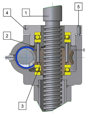 The unit allows the lash between the drive sleeve and the Work Screw thread(1) to be accurately controlled by the relative position of the upper (2) and lower (3) drive sleeves.